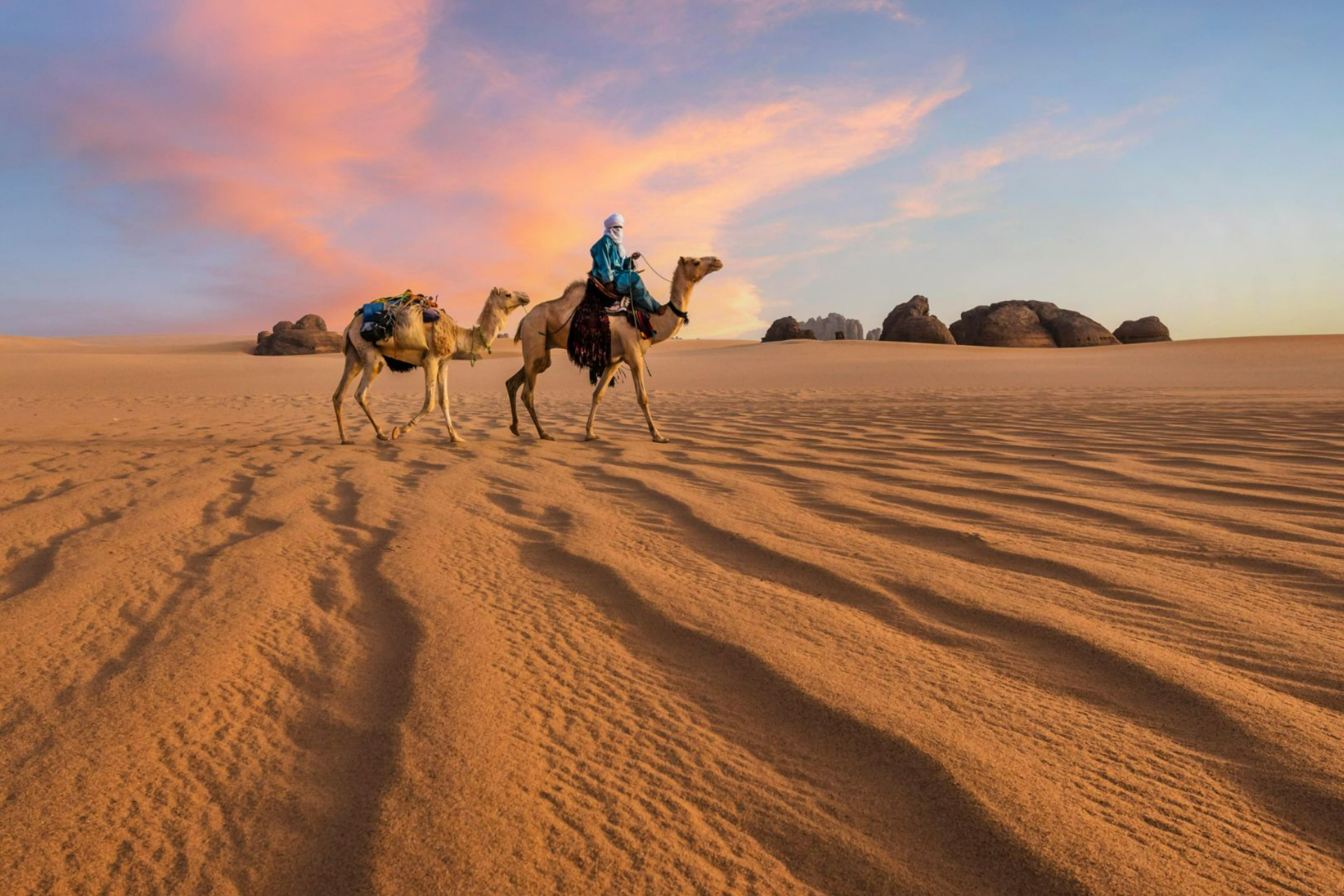 Po śniadaniu w Constantine czeka nas wyprawa poza miasto, do jednego z mniej oczywistych, a niezwykle malowniczych miejsc – Tiddis. Ta niewielka rzymska osada, zawieszona wśród wzgórz, wyróżnia się nie tylko swoim położeniem, ale i niezwykłą, czerwoną barwą ziemi. Wśród falującego krajobrazu odkrywamy pozostałości świątyń, forum i term – znajome elementy świata rzymskiego, tutaj wpisane w surową, niemal pustynną scenerię. Po powrocie do miasta czeka nas lunch w pałacowych wnętrzach, gdzie towarzyszy nam muzyka malouf – charakterystyczny dla regionu styl arabsko-andaluzyjski, który w Constantine rozbrzmiewa szczególnie autentycznie. Popołudnie poświęcamy na odkrywanie miasta, które Alexandre Dumas nazwał „gniazdem orła”. Dawna Cirta, stolica Numidii za czasów Massinissa, zachwyca swoim spektakularnym położeniem. Miasto rozpięte nad głębokim wąwozem rzeki Rhumel przecinają imponujące mosty – w tym Sidi M'Cid Bridge, zawieszony 175 metrów nad przepaścią. Spacer w tej scenerii to doświadczenie niemal teatralne. W obrębie kasby odwiedzamy pałac Palais Ahmed Bey – miejsce związane z ostatnim bejem, który stawiał opór francuskiej kolonizacji. To przestrzeń pełna historii, detali i emocji. Wieczorem transfer na lotnisko i przelot do Djanet – bramy Sahary. Po przylocie krótki transfer do hotelu i nocleg.